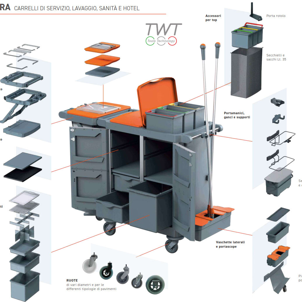 Carrelli Opera TWT. Attrezzature per pulizia professionale, carrelli Hotel, Sanità e multiuso. I…