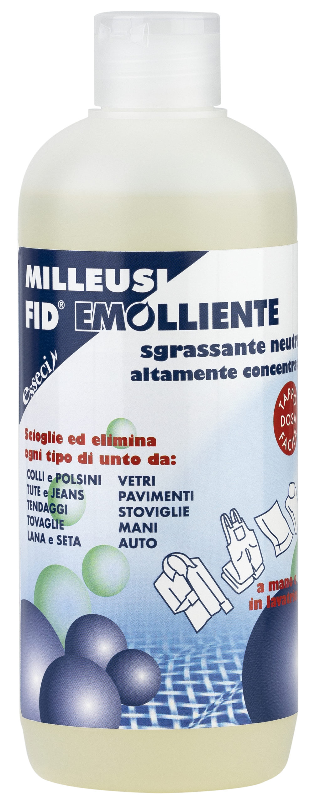IN LAVATRICE Unire al detersivo 1 o 2 cucchiai di emolliente nella fase di prelavaggio; ciò eliminerà dagli indumenti l’unto organico che sarà espulso dalla lavatrice con l’acqua senza lasciare incrostazioni, specie nella gomma di scarico che l’unto tende a logorare. BUCATO a MANO Unire al detersivo 1 o 2 cucchiai di emolliente. TUTE DA MECCANICO, GREMBIULI, BLUE JEANS, TOVAGLIAME Spalmare il prodotto sulle parti sporche, poi mettere tutto in lavatrice. Per macchie tenaci lasciare assorbire e strofinare prima del lavaggio in lavatrice. COLLETTI E POLSINI Coprire le parti unte con l’emolliente e mettere in lavatrice. LANA, SETA, NYLON, COPERTE, TENDAGGI Fare un prelavaggio con 2 cucchiai di emolliente poi fare un lavaggio con un misurino di prodotto per lana ed eseguire il programma lana. VETRI e SUPERFICI LAVABILI Miscelare 200 grammi di alcool denaturato con l’emolliente pari ad una punta di cucchiaino e 200 grammi di acqua. Agitare bene e usare come consuetudine. LAVELLI, PIASTRELLE, PAVIMENTI, WC Usare una piccola quantità di prodotto su una spugna umida e strofinare. AUTO Miscelare 5 litri di acqua con 2 cucchiai di prodotto. Usare come di consueto. STOVIGLIE Riempire un lavello d’acqua calda e sciogliervi 1 o 2 cucchiai di prodotto.